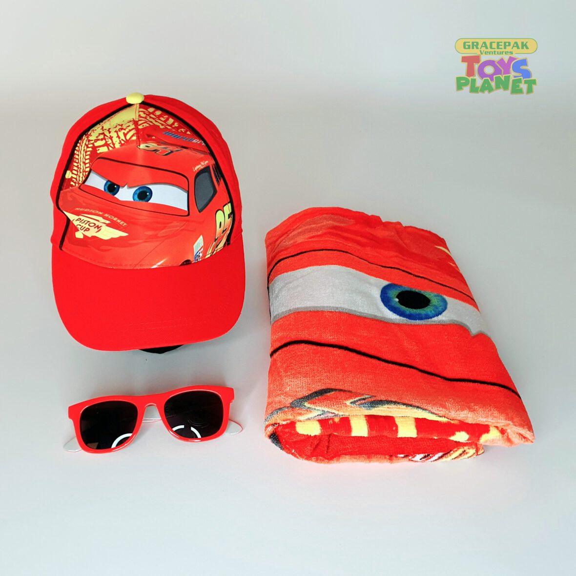 Lightning McQueen branded 4-in-1 beach set; comprising Bag, Towel, Caps & Sunglasses