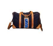The Beaded Canvas Travel Bag combines a navy blue canvas exterior with contrasting tan leather accents for a stylish and practical design. A vibrant blue beaded strip adds a unique, eye-catching element to the bag. Its spacious interior is ideal for carrying travel essentials or everyday items, while the sturdy handles ensure comfortable carrying. Overall, this beaded canvas travel bag is a versatile and fashionable accessory, perfect for both travel and daily use. Height: 11.3inches, Width: 18.2inches, Base; 18inches