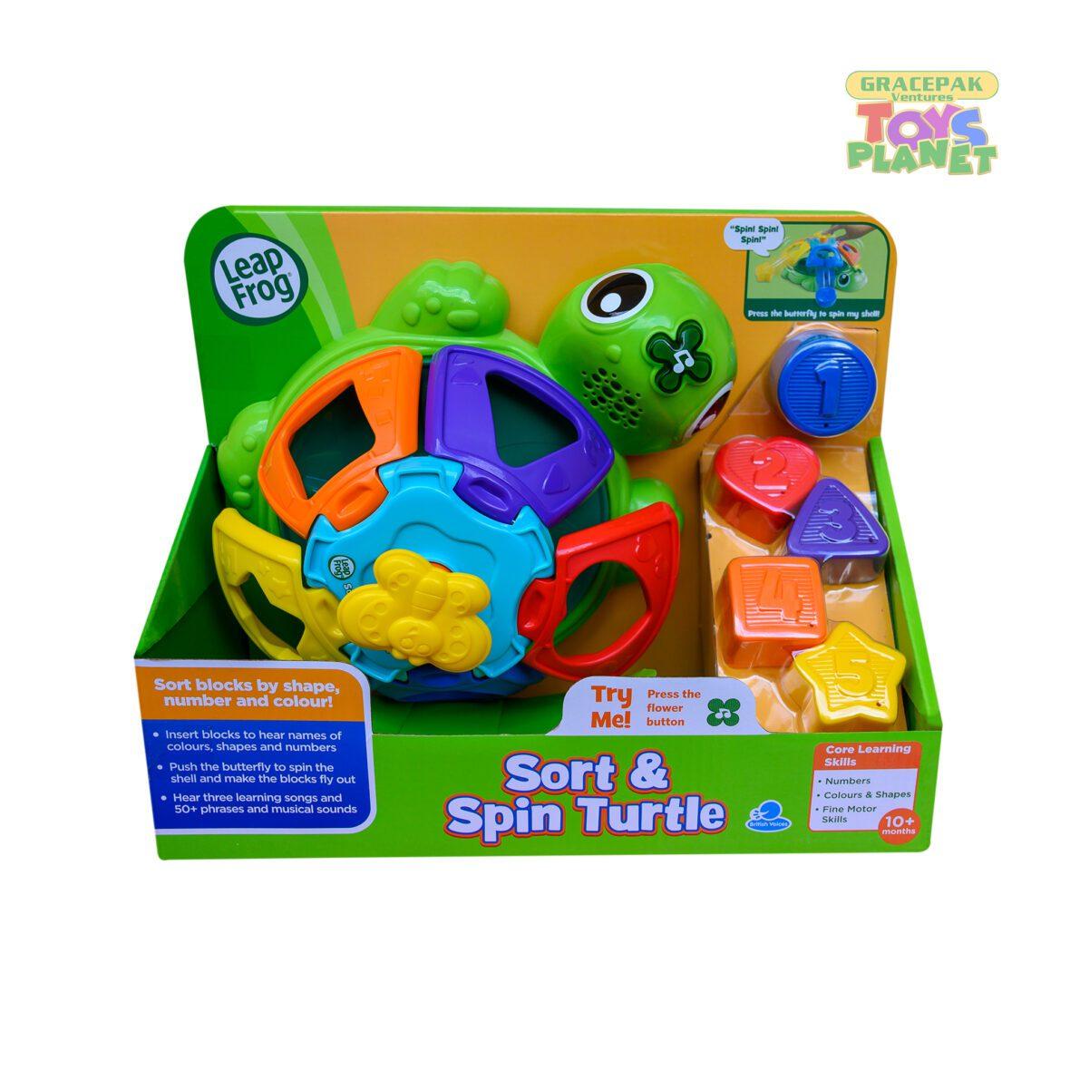 Learn about shapes by inserting the five brightly colored pieces into the correct holes in the turtle?s shell. Our Sorting Surprise Turtle recognizes each shape piece and says fun phrases about the shape, color and number on each one as it?s fit inside the shell. Press the butterfly button on top of the shell and watch as it plays music and rhymes while sending the shape pieces flying out. Push the light-up flower button on the turtle?s head to hear three playful learning songs. Sorting toy is intended for toddlers ages 9 months to 2 years old; 2 AA batteries are included for demo, use new batteries for regular use.