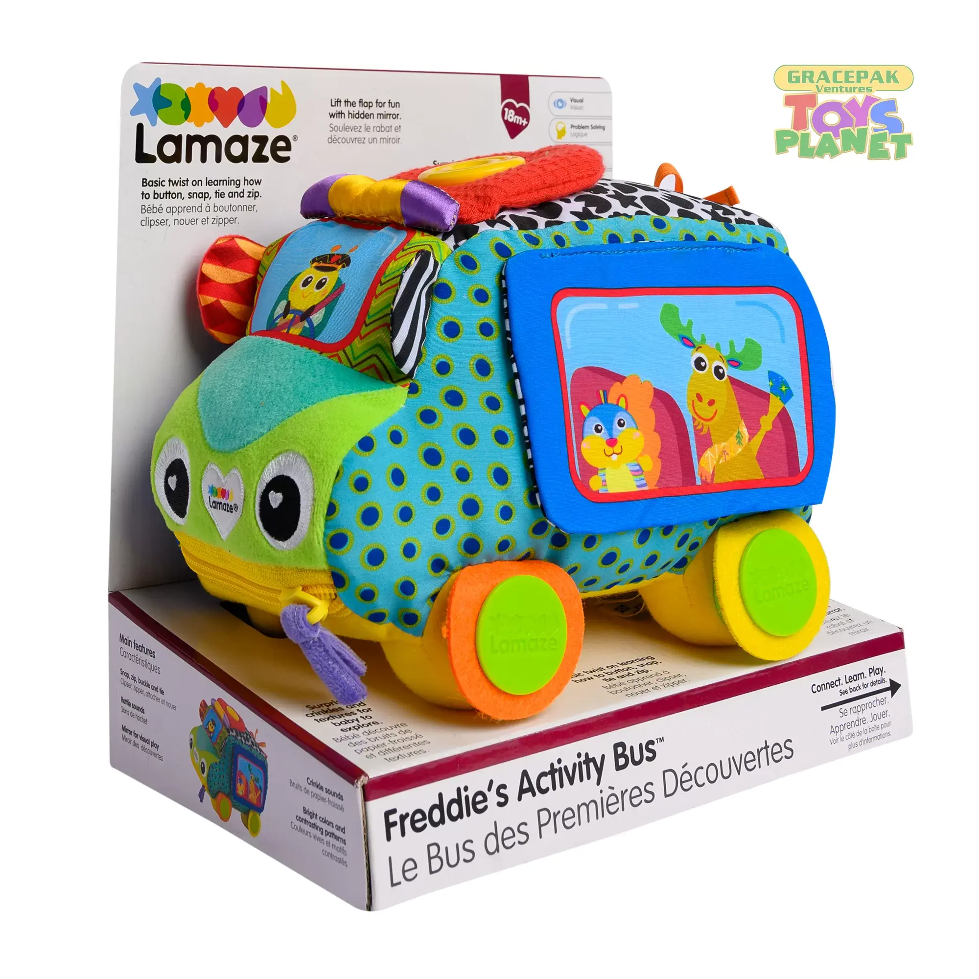 Our Lamaze Freddie’s Activity Bus makes getting ready for preschool or day care easy. It helps your growing baby learn to snap, zip, button and tie with Freddie and his colorful bus. The bus toy has a button top, snappy wheels, and a hidden friend who peeks out from under the zipper. This baby toy also features surprise crinkles and textures for baby to explore and a flap for fun with a hidden mirror. It’s never too early to start thinking about school readiness.